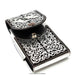 This men's western leather smartphone case is expertly crafted in Mexico, with a 7" high and a 3.5" width for a comfortable fit. The vibrant silver and black combination is achieved through laser cutting, adding a modern touch to a classic accessory. Complete your outfit with this stylish and high-quality belt.