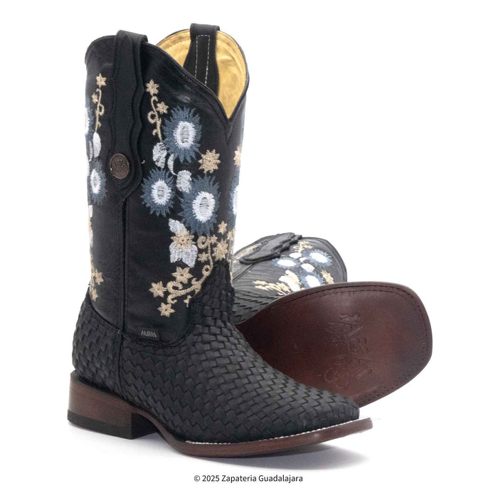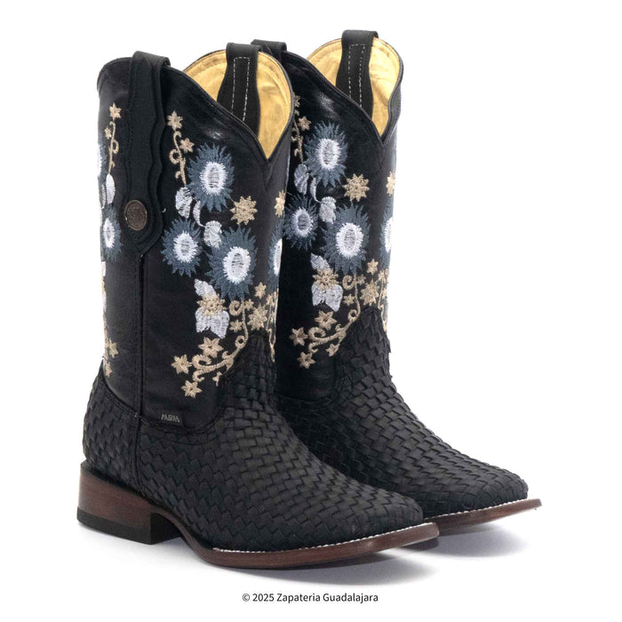 Bota vaquera para dama tejido petatillo. Tubo bordado de 12 in. Corte y forro de piel, asi como la suela de vaqueta. Tacon de 1.5 in. de alto.