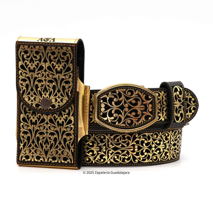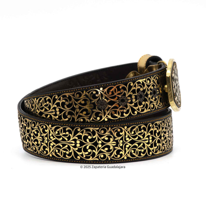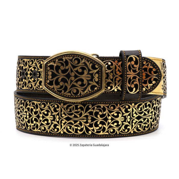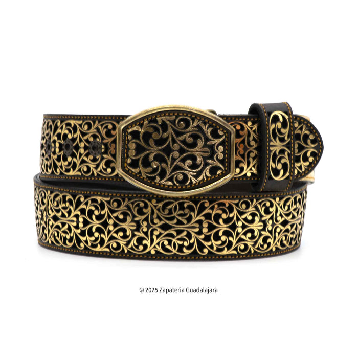 This men's western leather belt is expertly crafted in Mexico, with a 2" width for a comfortable fit. The vibrant gold and black combination is achieved through laser cutting, adding a modern touch to a classic accessory. Complete your outfit with this stylish and high-quality belt.